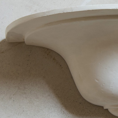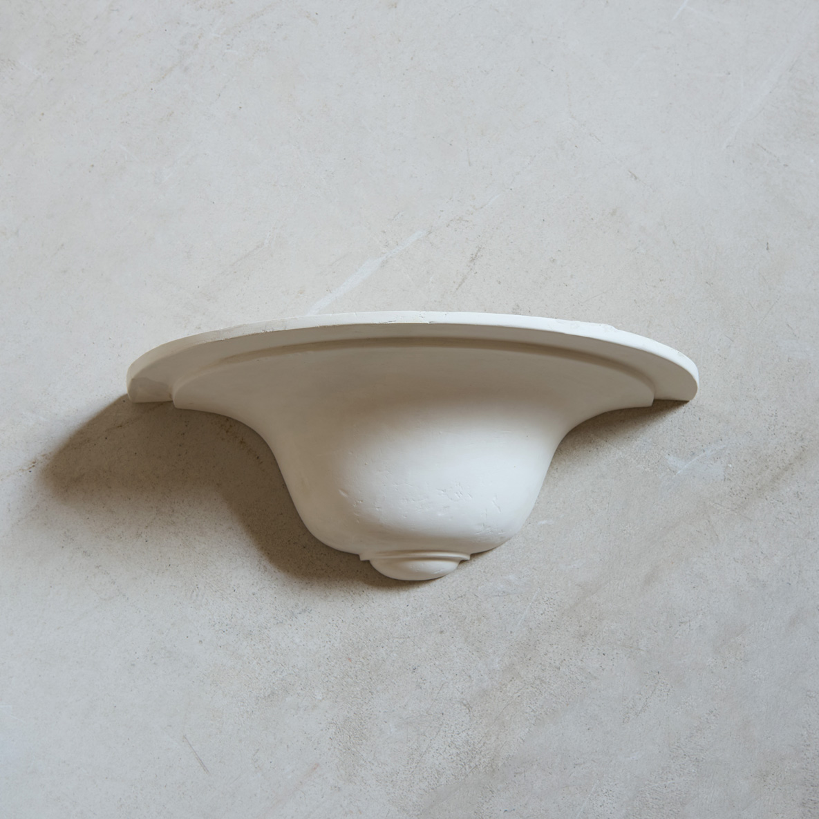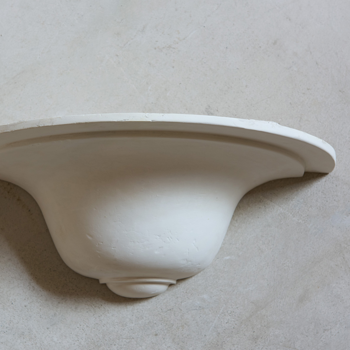 Pareja de apliques de yeso Art Decó. Este aplique de yeso es una delicada pieza que rinde homenaje a la elegancia clásica con una simplicidad serena. Su forma semicircular, suavemente curvada, recuerda a las antiguas ménsulas arquitectónicas o a las copas invertidas de las fuentes renacentistas, proyectando una presencia sutil pero con carácter.