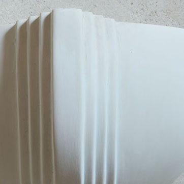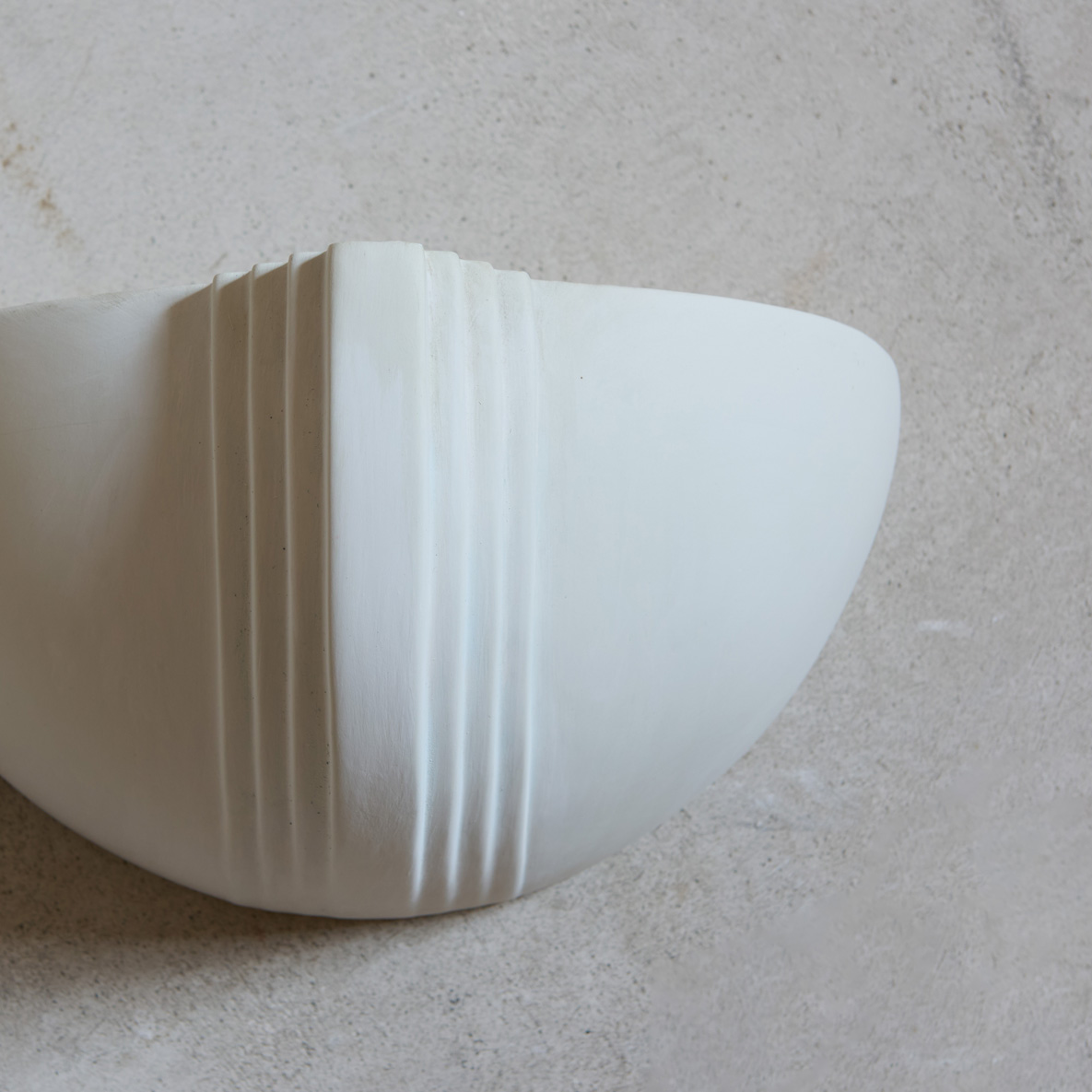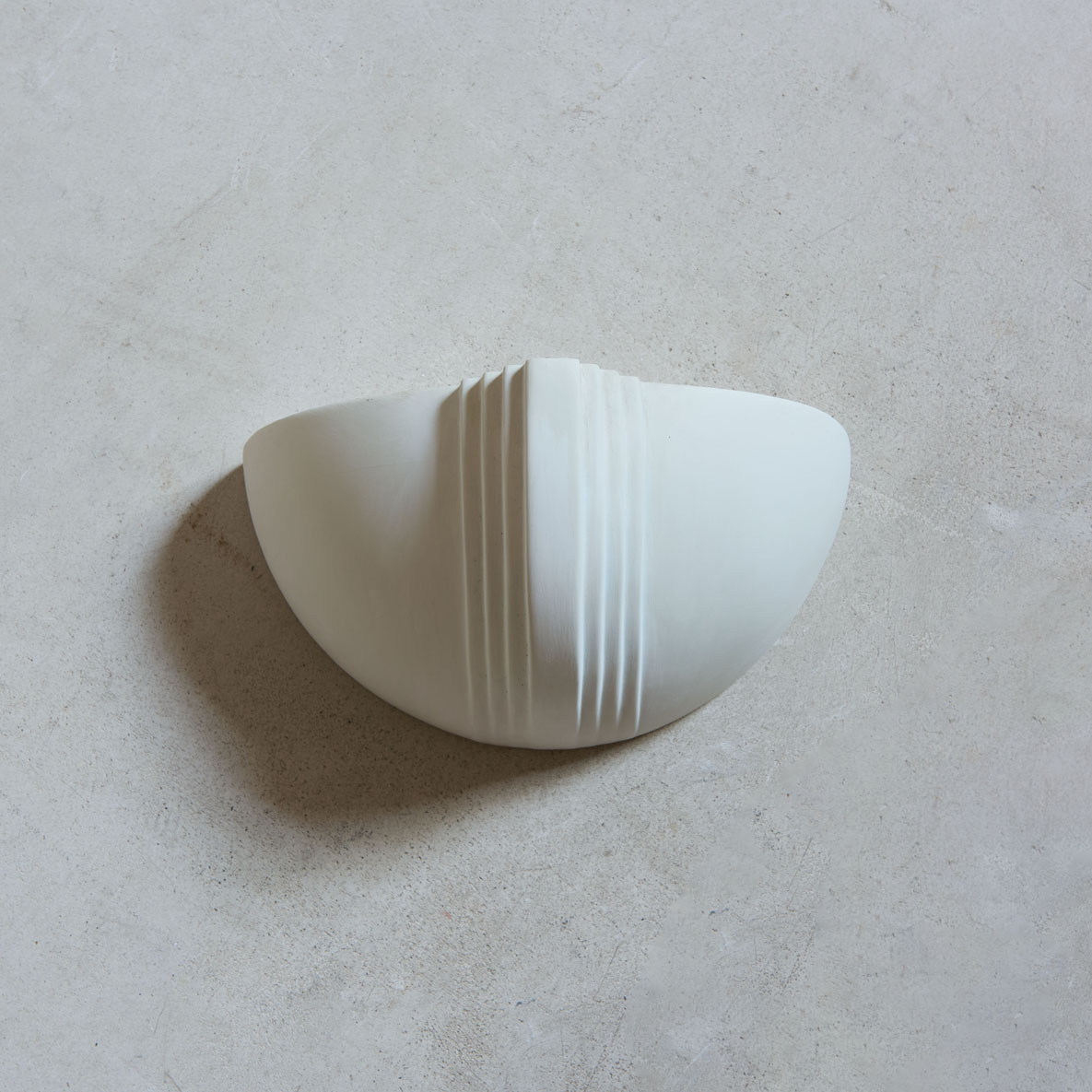 Pareja de apliques de yeso antiguos. Una pieza elegante, serena y atemporal. Su forma semicircular, suavemente curvada, evoca una media luna suspendida en el muro, mientras que las delicadas hendiduras verticales talladas en el centro aportan un ritmo sutil que equilibra la sencillez de su silueta. El acabado blanco mate, con su textura ligeramente porosa, refleja la luz con una suavidad cálida que realza su carácter artesanal.