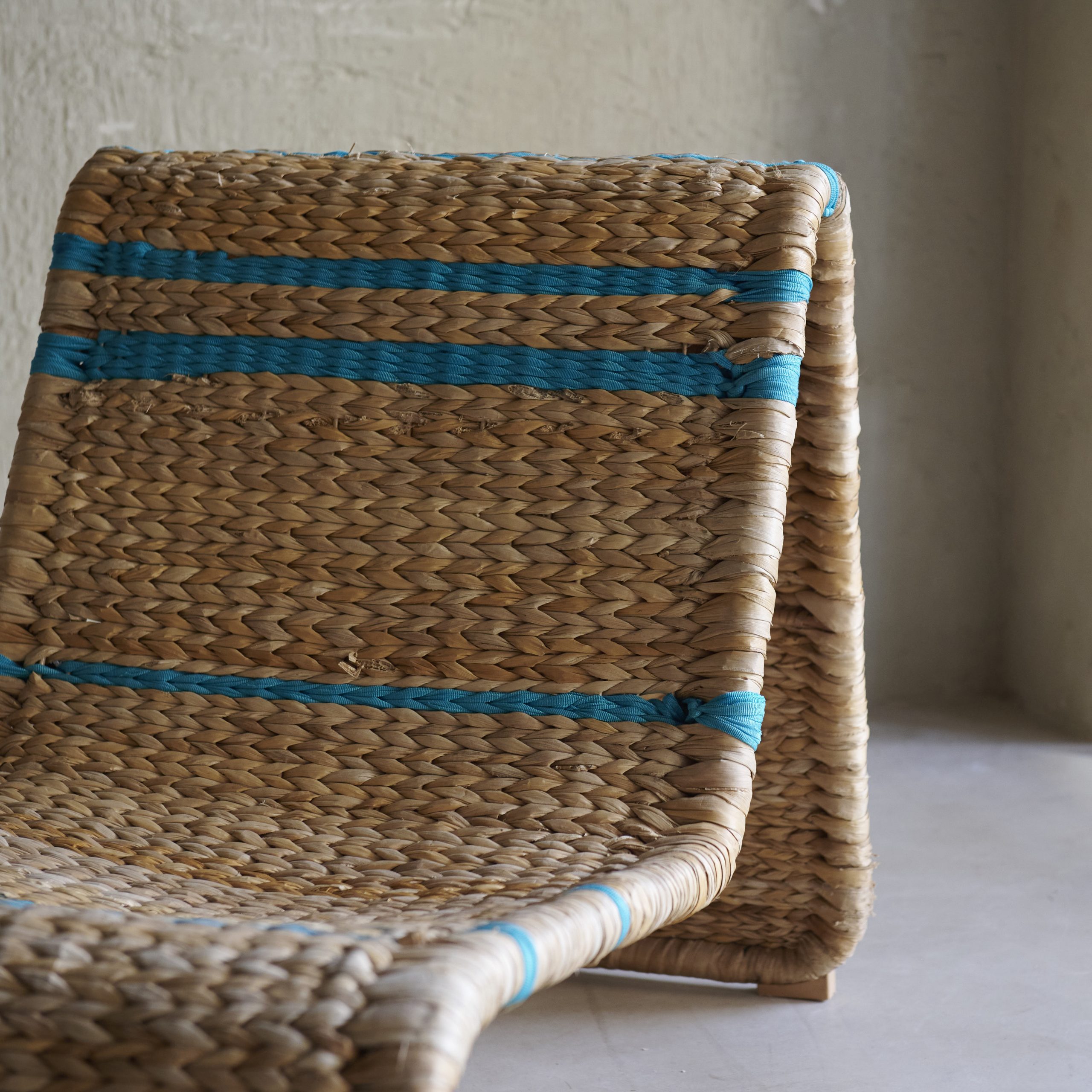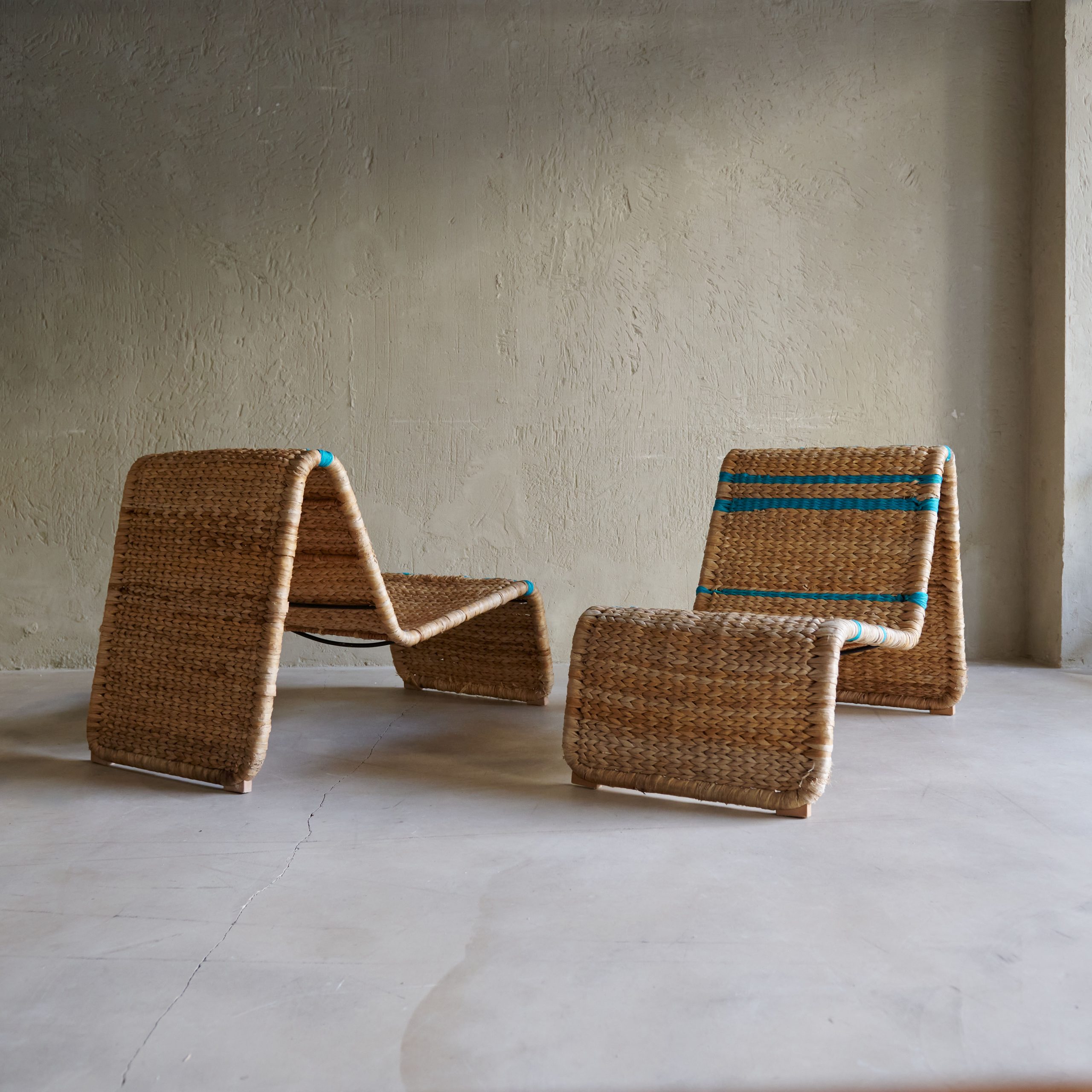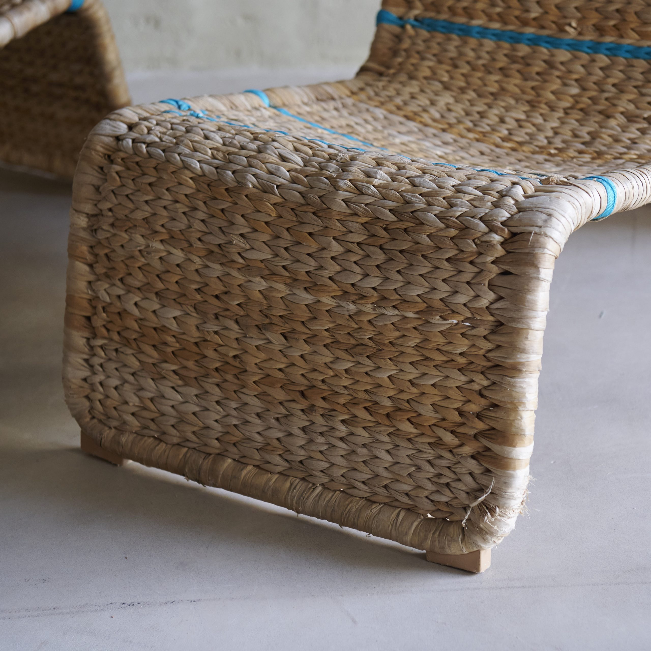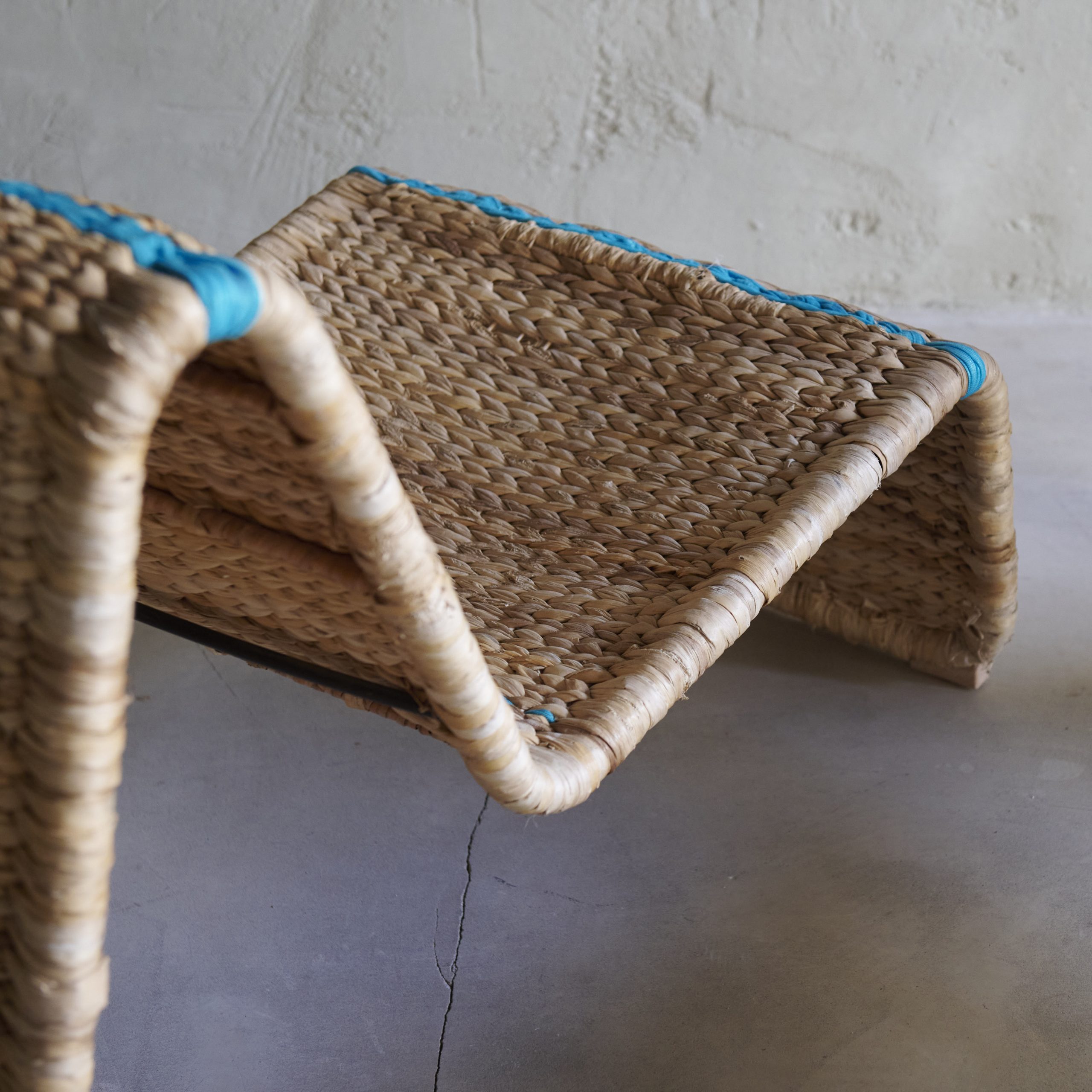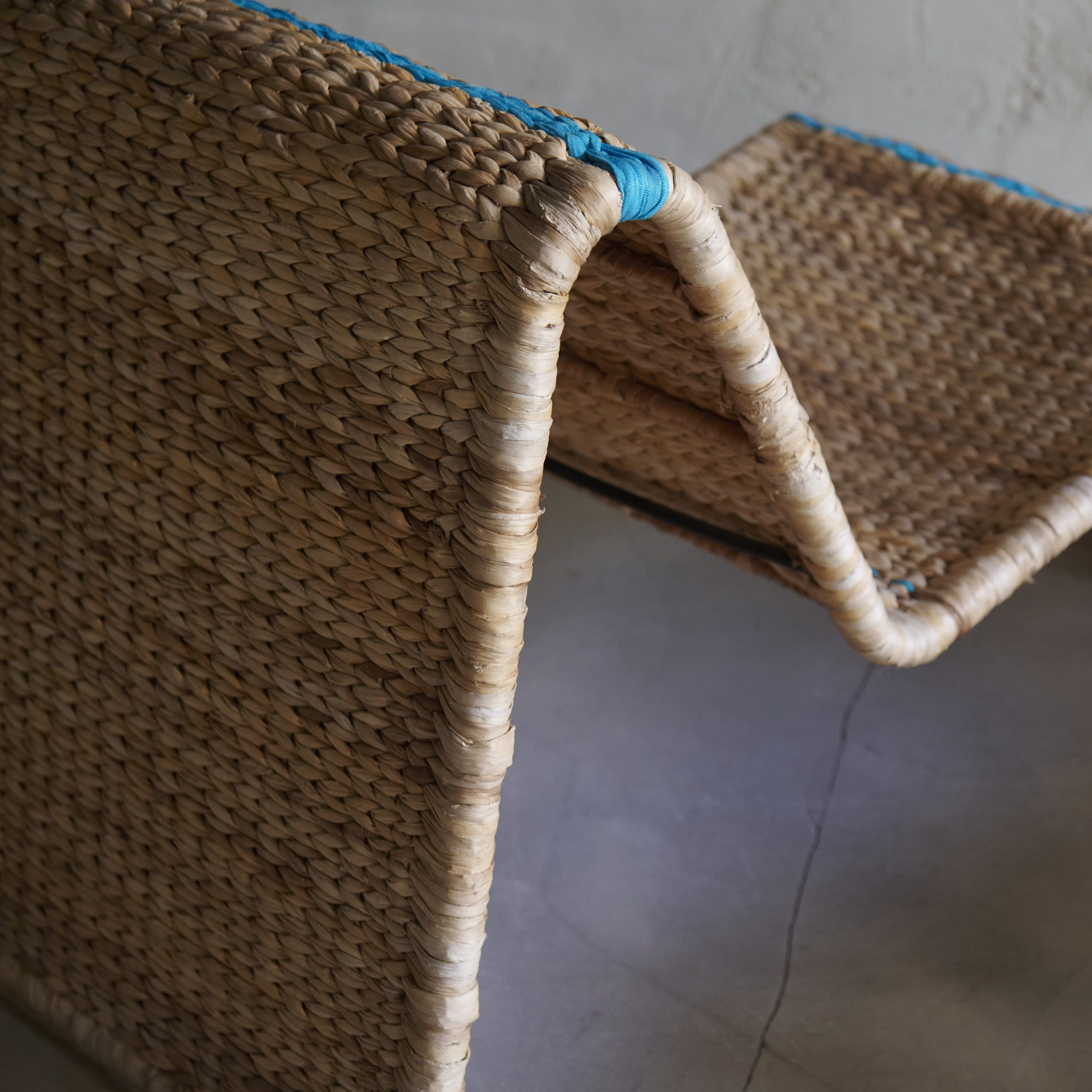 Pareja de butacas de rafia nórdicas. Originales y modernas butacas vintage de los años 70 cuyo diseño presenta formas fluidas y sinuosas mediante una fuerte estructura de metal. La rafia de color natural se entrelaza con una pasamanería turquesa muy especial, creando un aspecto único y diferente en cada butaca. Piezas con carácter y estilo propio.