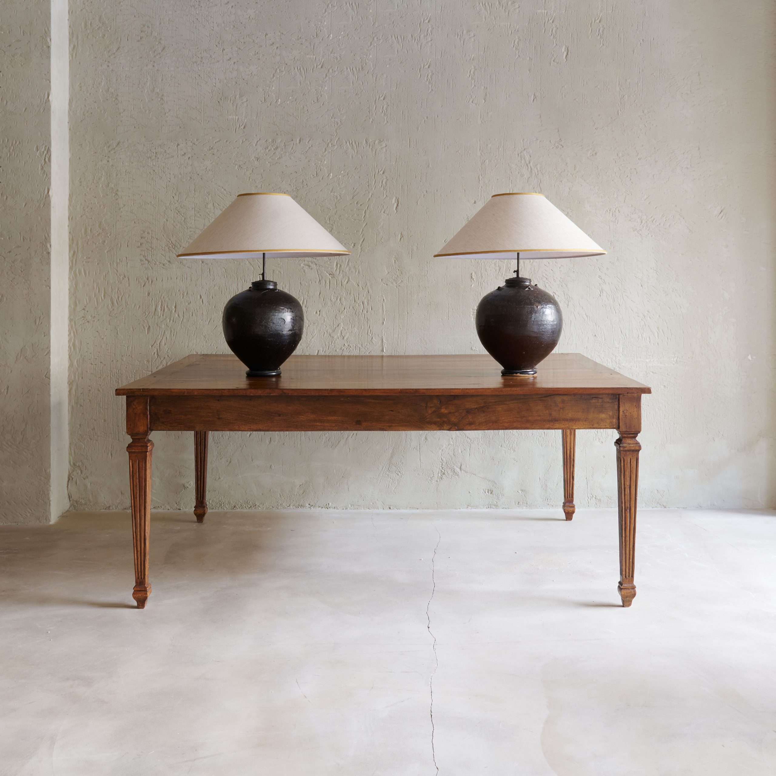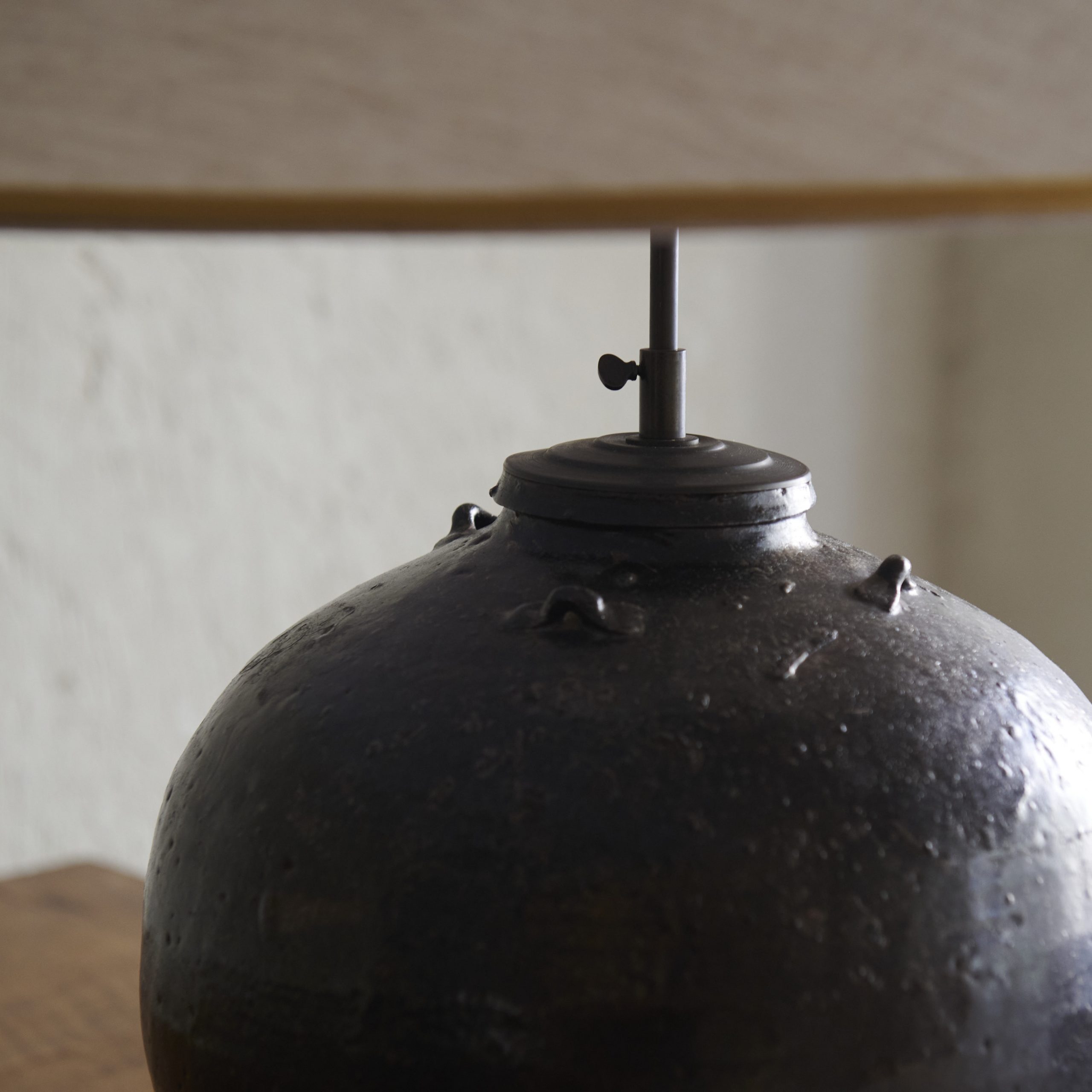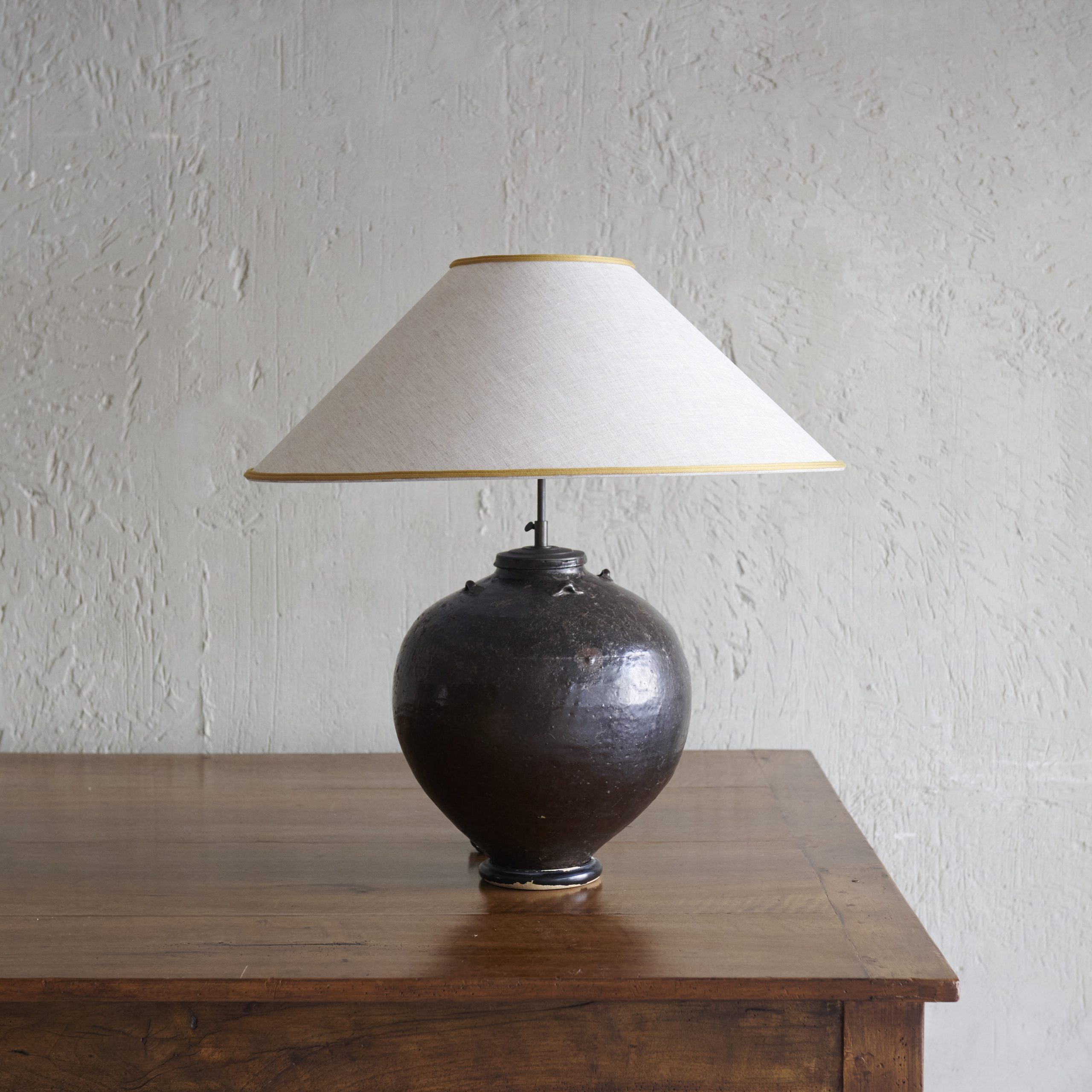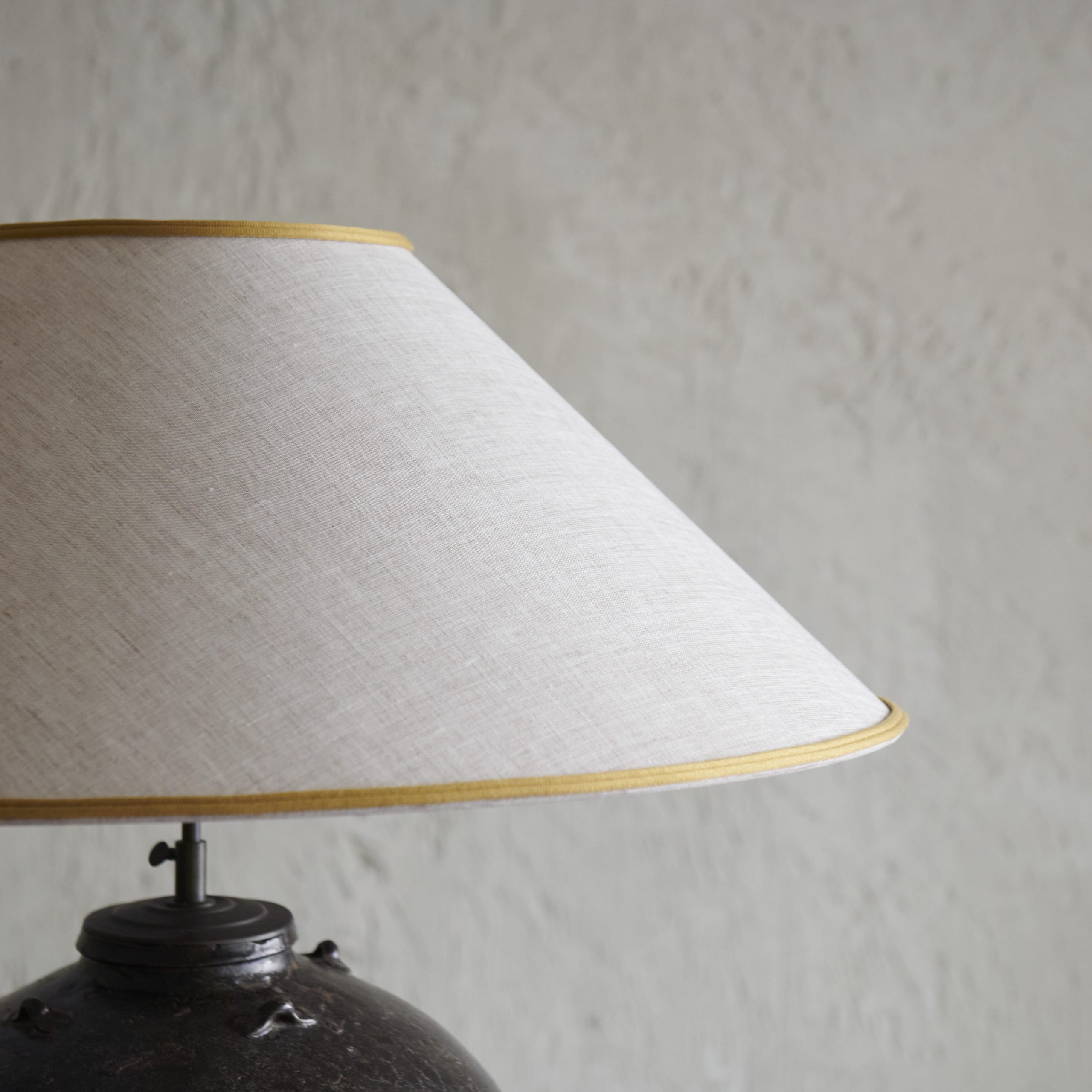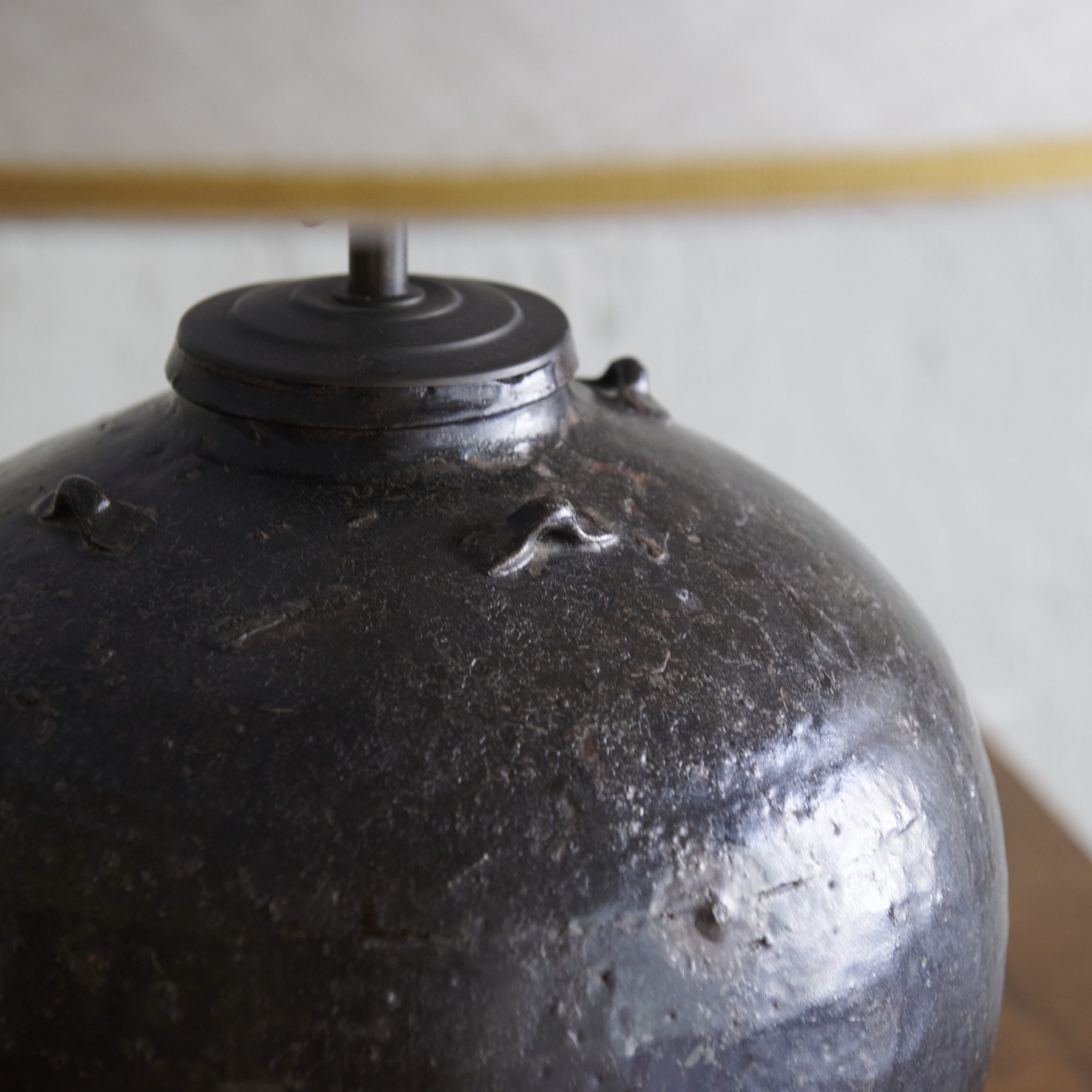 Pareja de lámparas de mesa negras vintage. Especiales y con encanto, estas lámparas de sobremesa vintage están fabricadas artesanalmente en cerámica de color negro, que presenta un acabado liso y suave, con sutiles marcas de la manufactura a mano, lo que le da un carácter único. Las hemos acompañado de unas pantallas cónicas de lino beige adornadas con un bonito ribete dorado. Unas piezas que van más allá de lo meramente funcional siendo elementos decorativos en sí mismas. Una pareja de piezas decorativas que aportan un aire sofisticado y nostálgico a cualquier habitación.