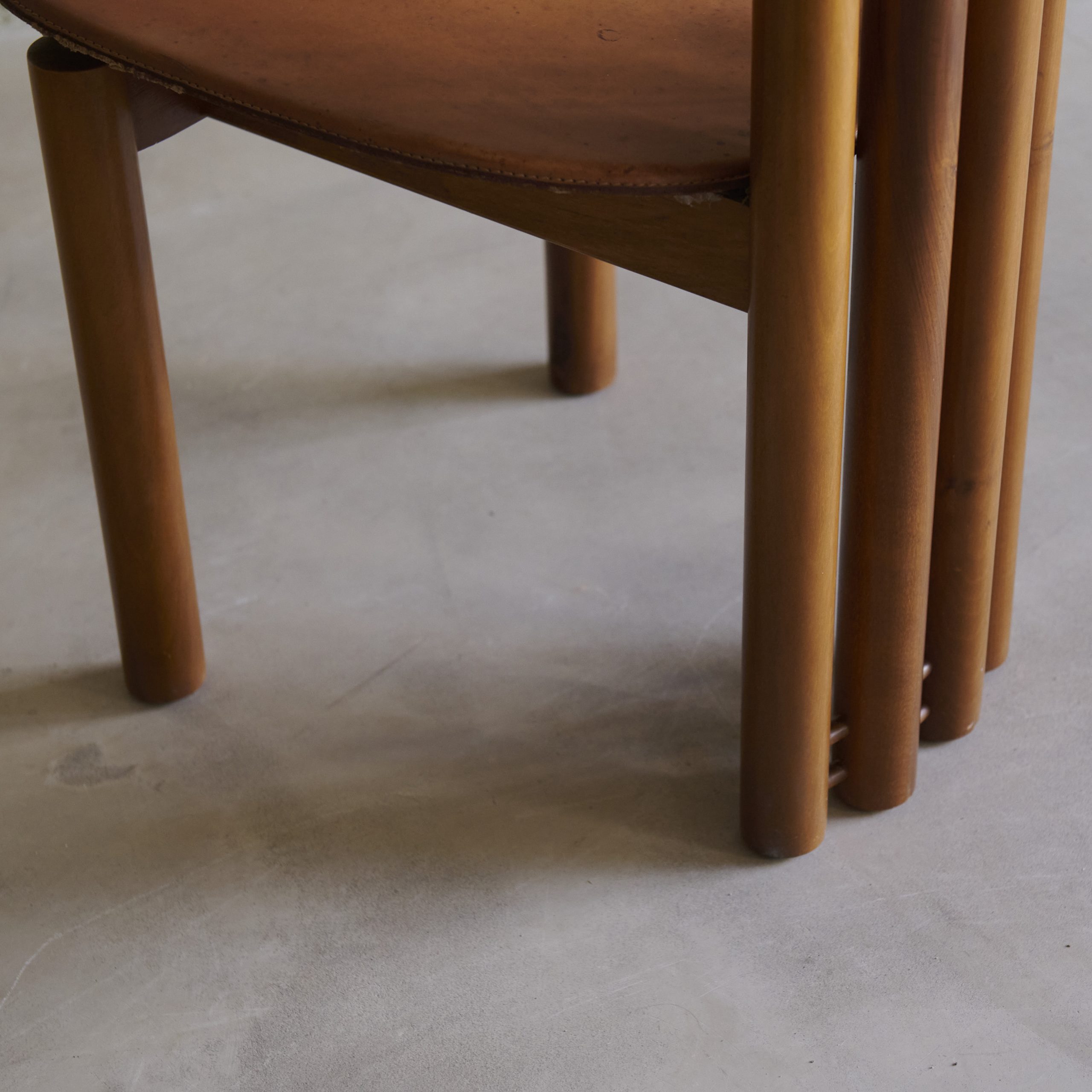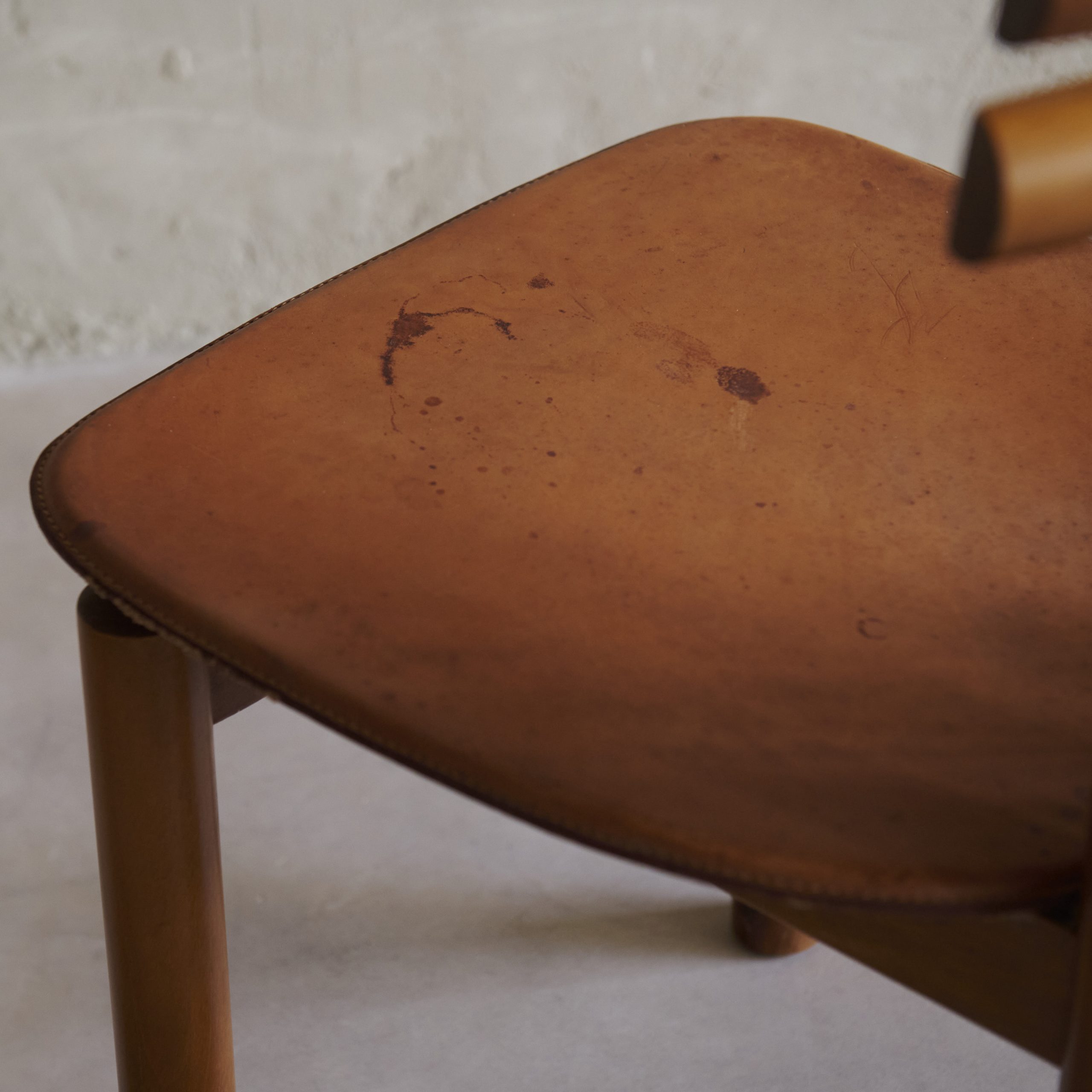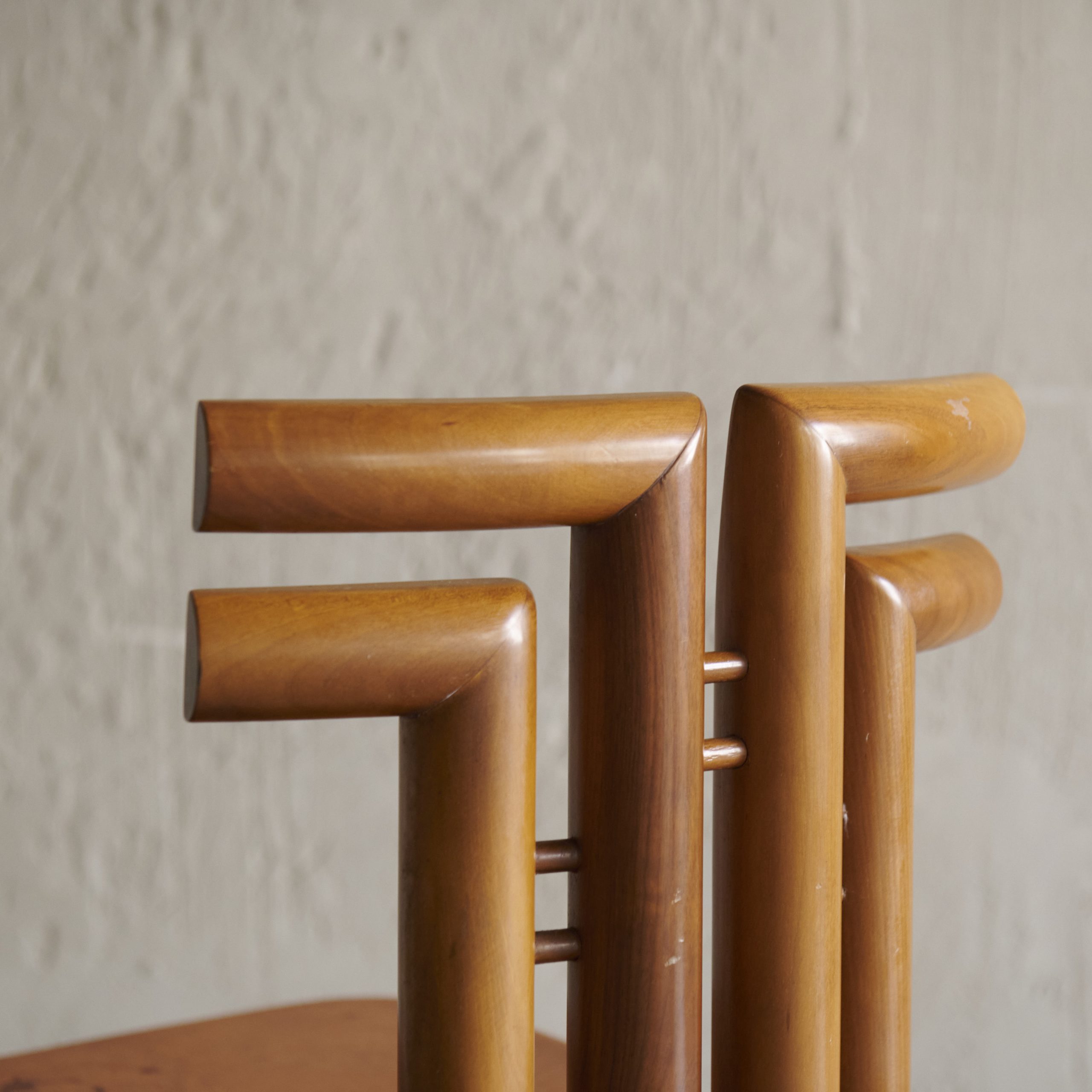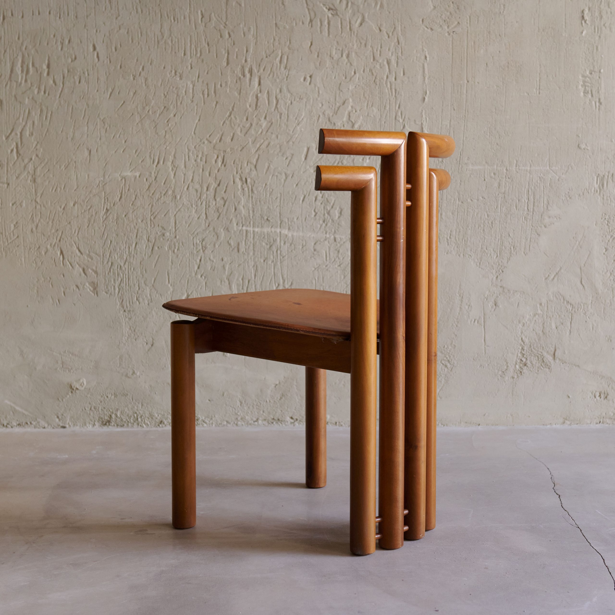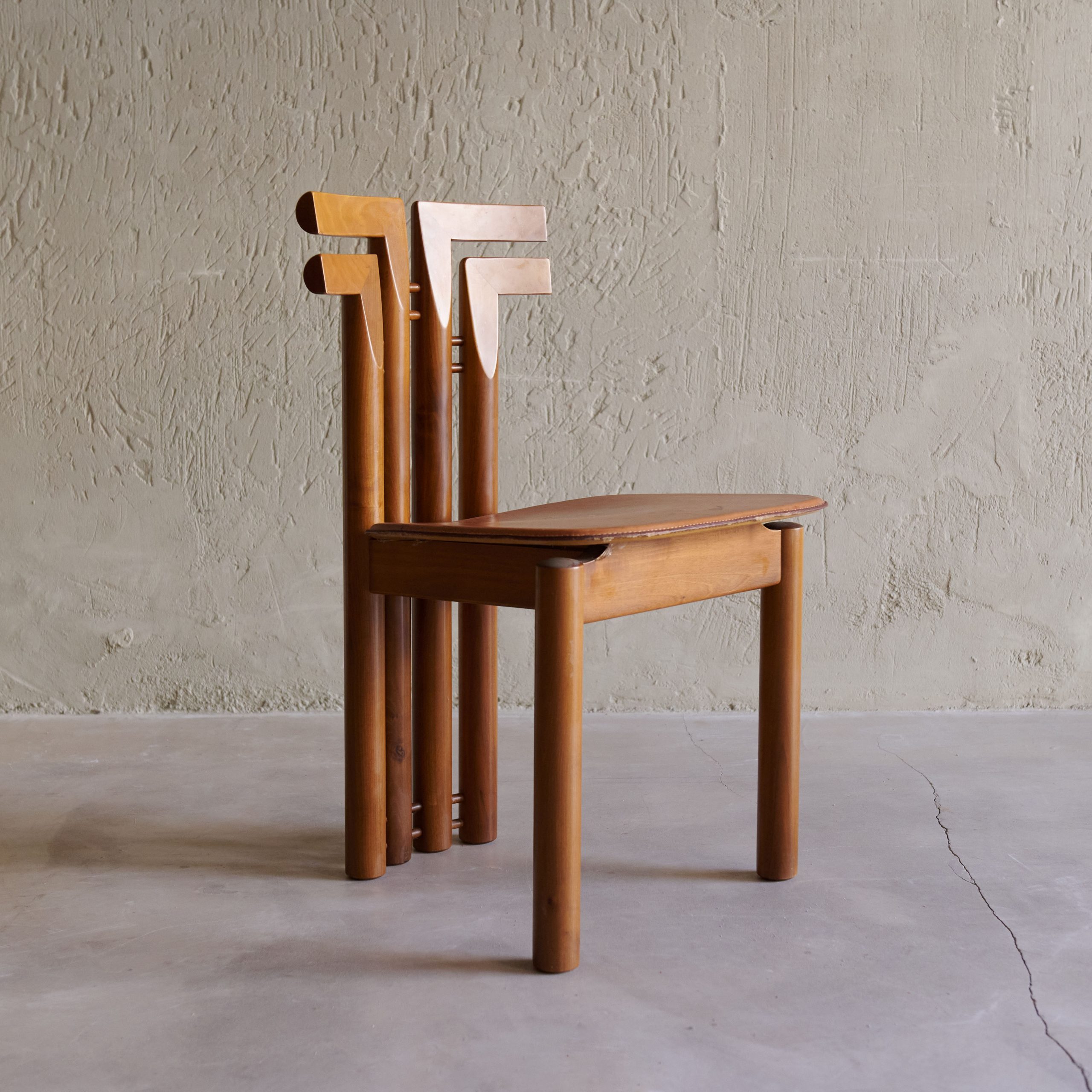 Pareja de sillas vintage de Mario Marenco. Diseñadas en los años 70 por una de las figuras más polifacéticas del mundo cultural italiano., se trata de dos piezas únicas, con gran personalidad y carácter que casi son una pieza escultórica en sí mismas. Fabricadas en madera de haya con modernas y desenfadas formas en su respaldo, su asiento es de cuero.