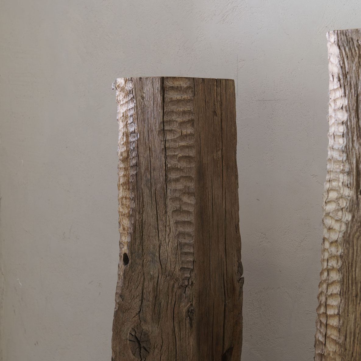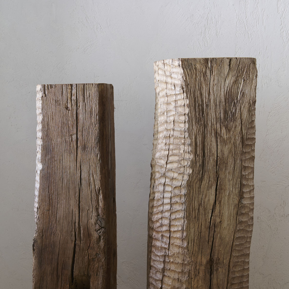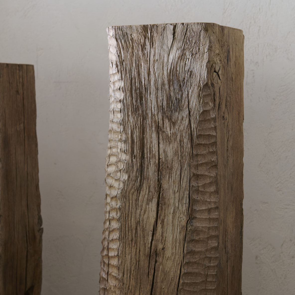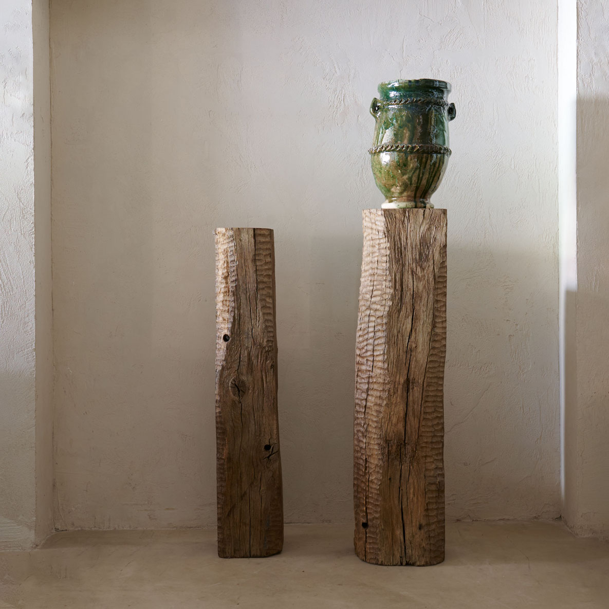 Peanas de madera de roble francesas. Con una textura rústica y un acabado natural, cada pieza de madera, de forma irregular, destaca por sus vetas y marcas que crean un vínculo entre la naturaleza y el diseño. Sus bases gruesas y sólidas elevan con elegancia los objetos que se expongan dando un protagonismo sutil pero sofisticado. De origen francés, son piezas únicas, perfectas para decorar los rincones con más encanto.
