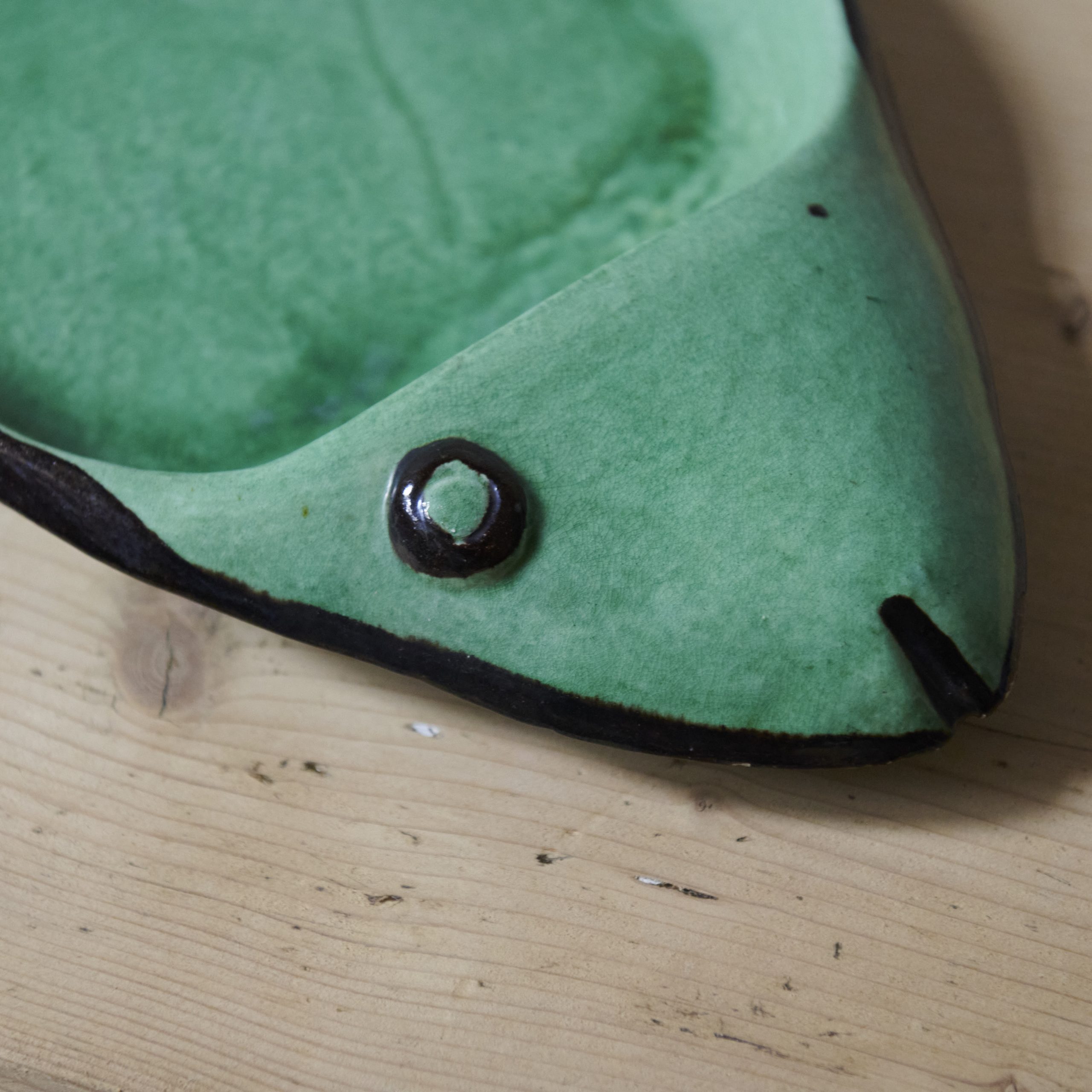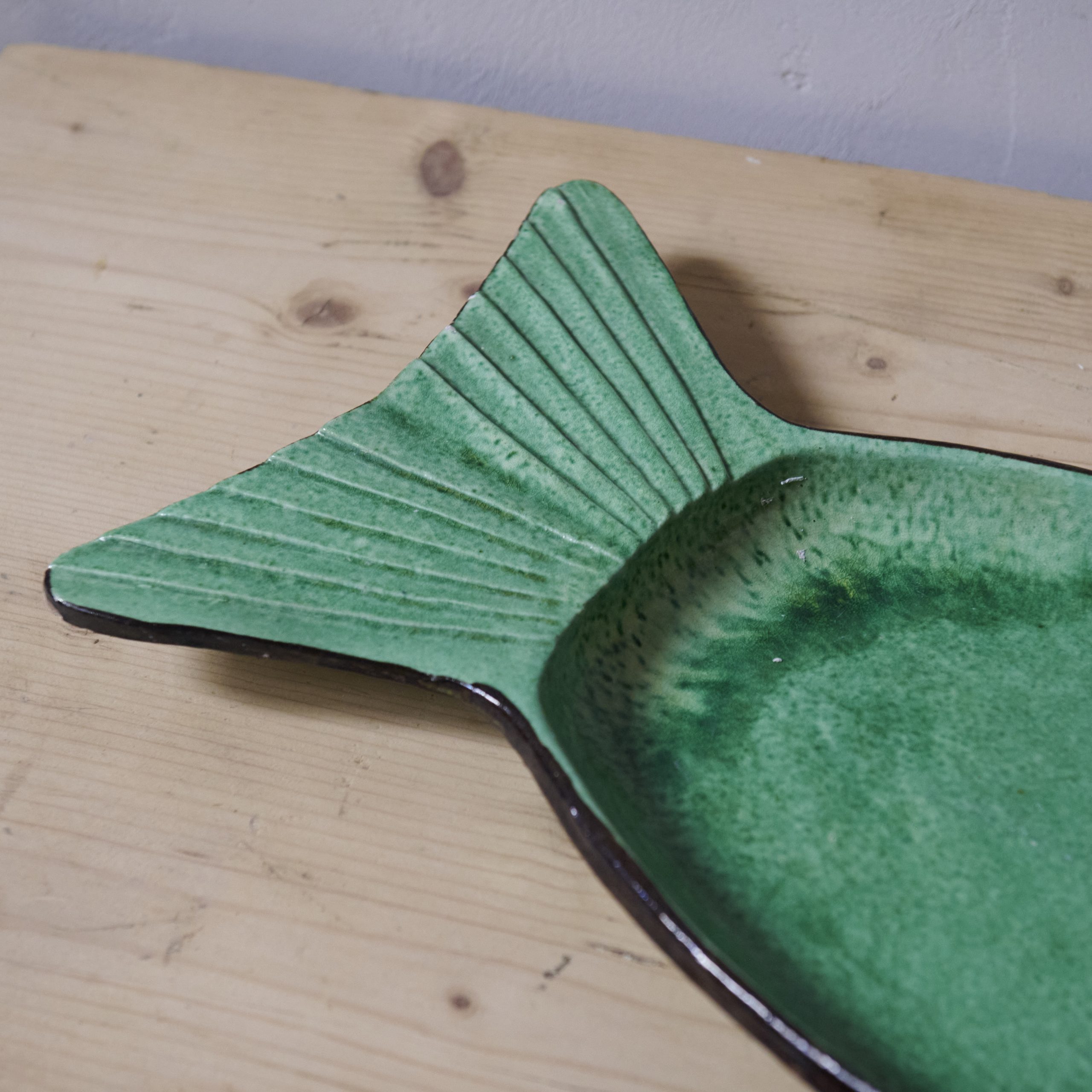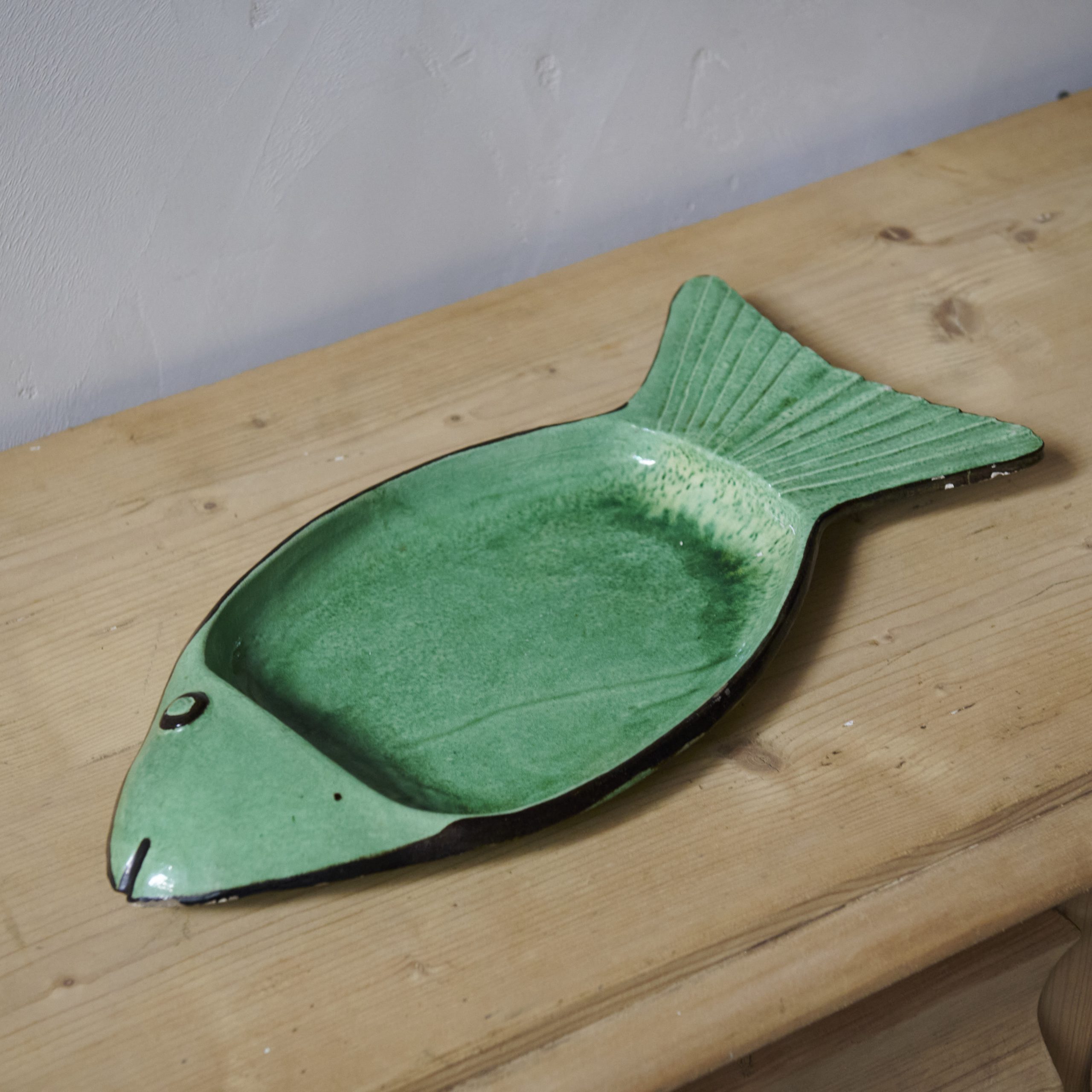 Pez decorativo de cerámica de Vallauris. Fuente en forma de pez, elaborada artesanalmente en cerámica de color verde, procedente de Vallauris, la ciudad francesa de la cerámica. De los años 70, es una pieza única y encantadora, representativa de la rica tradición artesanal de esta región de la Costa Azul en Francia y claro ejemplo de la influencia de la estética mediterránea y el enfoque artístico que marcó la producción cerámica en el siglo XX.