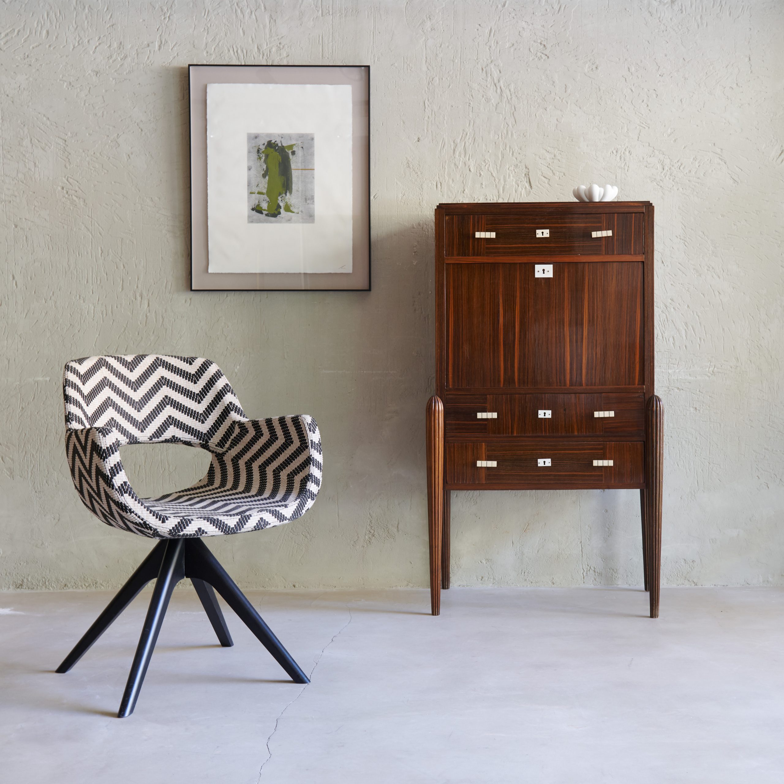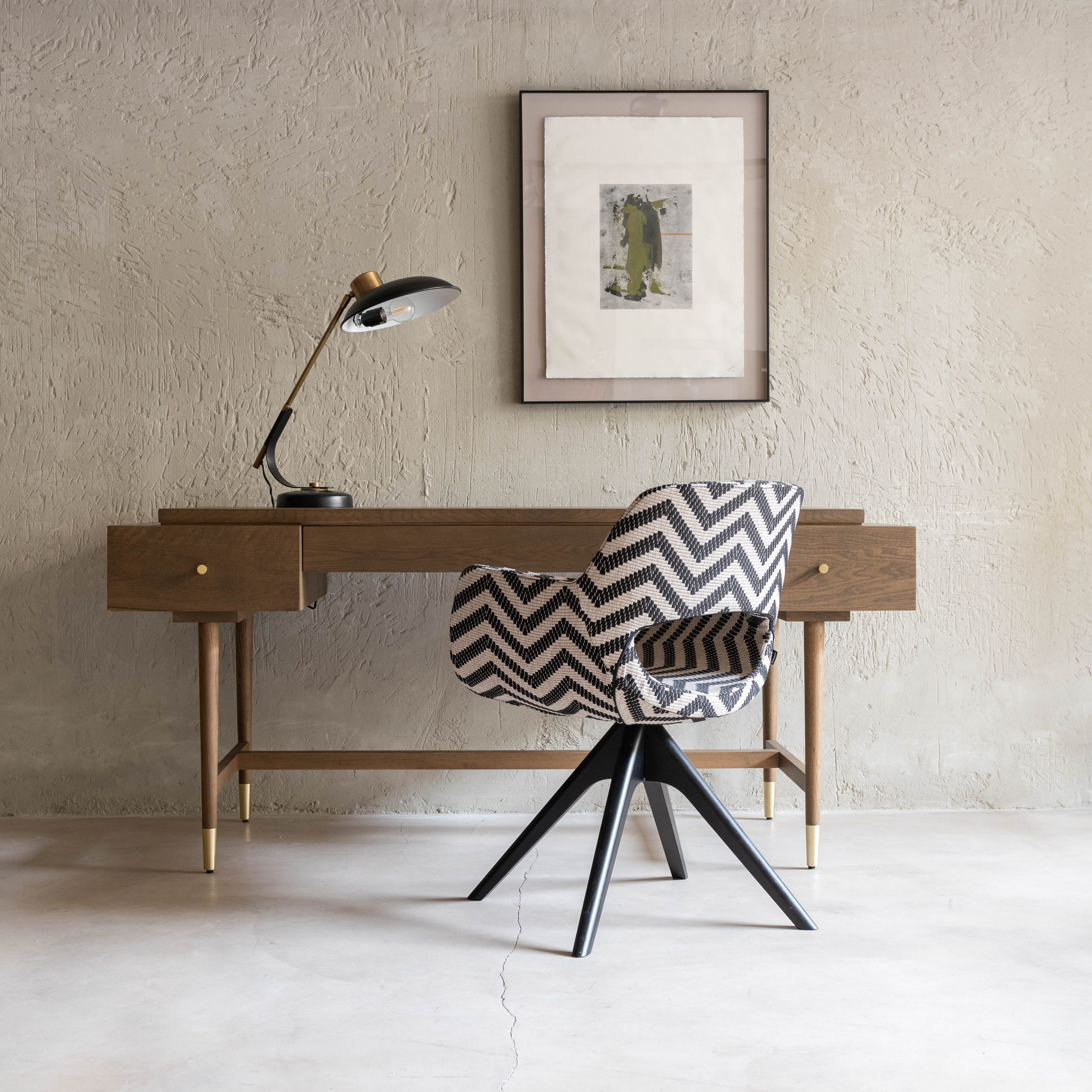 Pareja de sillas giratorias tejido Marelle. Disponible por encargo, esta original silla giratoria tiene un diseño elegante y atemporal, Con bonitas patas negras de madera, se presenta tapizada con una atrevida tela de la firma española Lizzo.