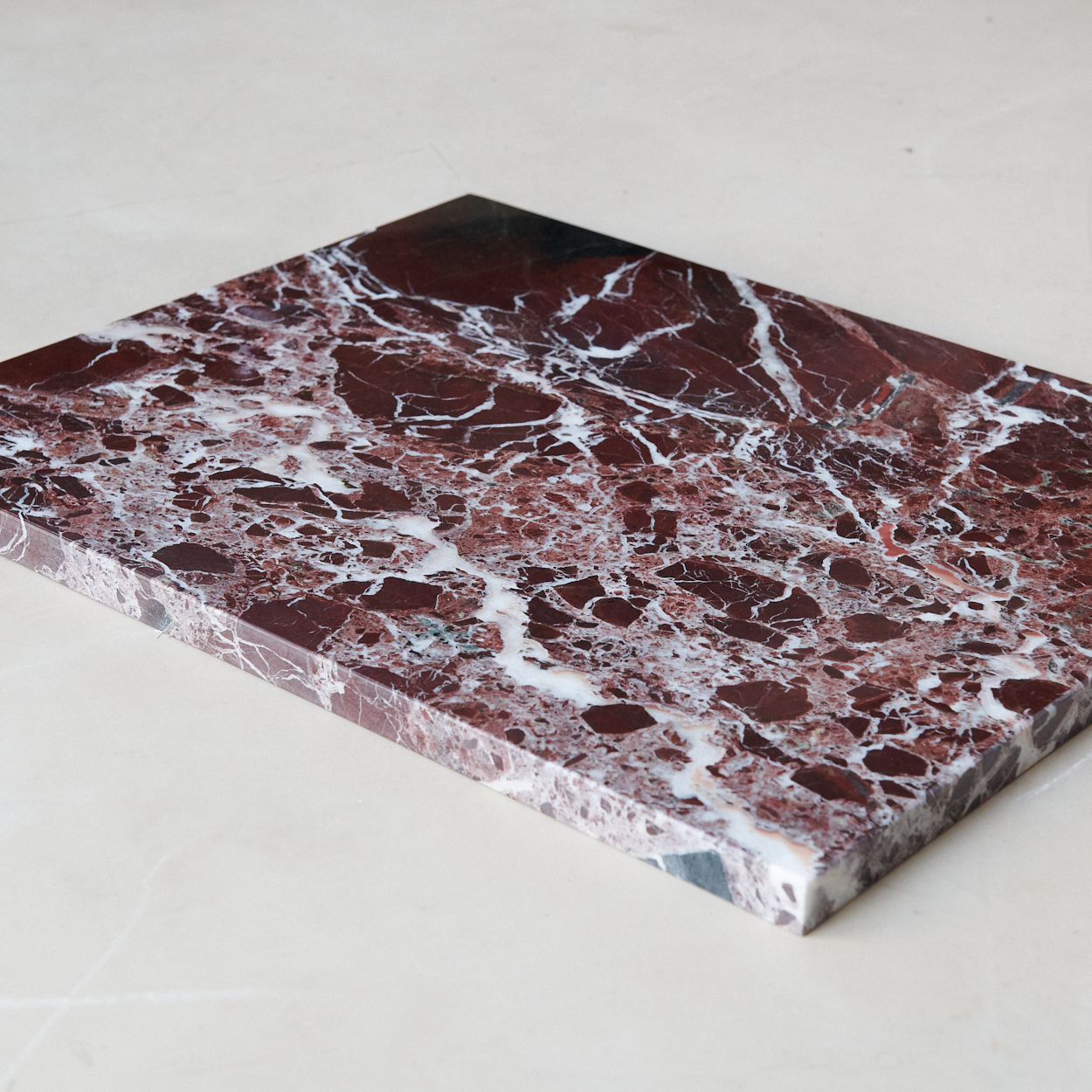 Tabla de mármol burdeos acabado pulido. Es un complemento perfecto para decorar cualquier estancia de la casa. Su espectacular veteado y su diseño clásico y elegante lo convierten en una pieza singular.